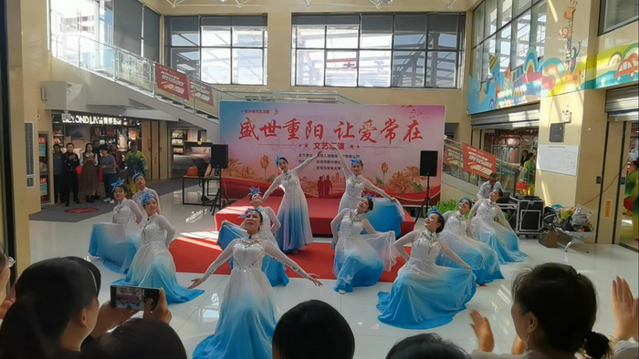 二是联合举办“盛世重阳、让爱常在”文艺汇演。组织艺扬舞蹈班走进人民商场,表演歌伴舞《走向未来》节目。她们以灵动的舞姿和优美的肢体语言,诠释了对未来的憧憬和期待。同时,融入了现代元素,既具有传统美感,又不失现代气息,引起驻足流连顾客的强烈共鸣,以及对中华民族伟大复兴的热切期盼。